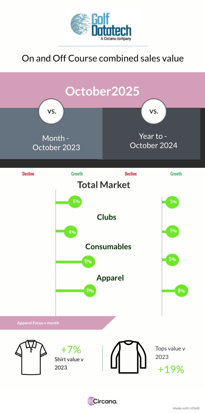 So how did the golf industry fair? Surprising well! Overall sales in value terms compared to last year were +11.6%. At first site this looks fantastic. However, deeper analysis shows that October 2024 did not perform as well as the previous year. So, it makes sense to compare this year’s figures with those in 2023. Golf once again bucked the retail trend showing an increase for the month of 5.7%. On the same basis clubs were +3.5%, apparel +11.0%, consumables +10.9% but light durables failed to break even at -0.5%.