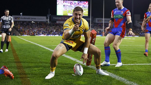 Zac Lomax celebrates a try. Â NRL Imagery