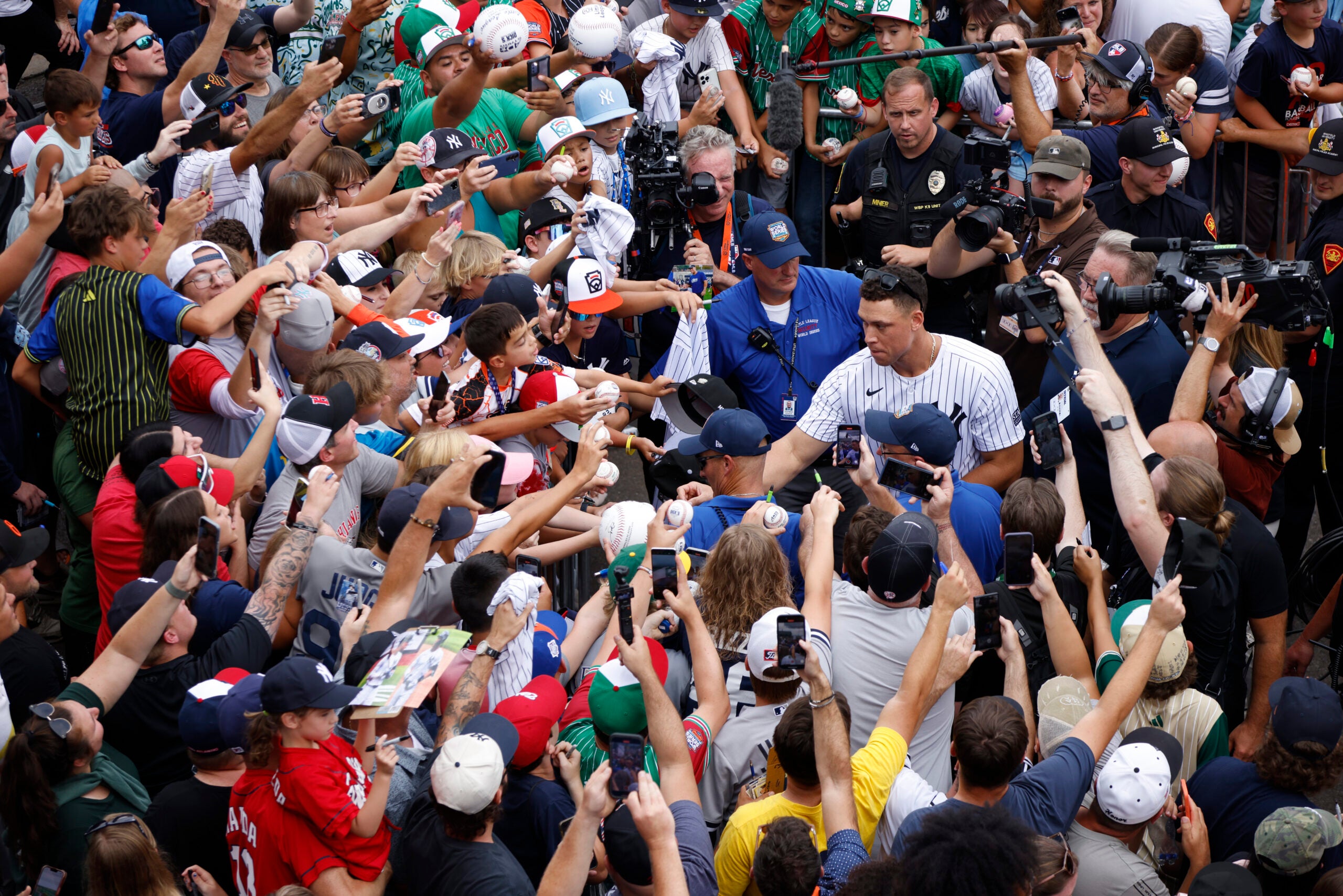 SOUTH WILLIAMSPORT , PA – AUGUST 18: Aaron Judge #99 o the New York Yankees signs autographs during a visit to the Little League International Complex prior to the 2024 Little League Classic on Sunday, August 18, 2024 in South Williamsport, Pennsylvania. (Photo by Rob Tringali/MLB Photos via Getty Images)