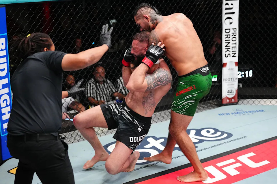 Hernandez didn’t back away from the challenge one bit, walking down Dolidze on the feet and canvas alike. He was respectful of the leg lock threat, sure, but Hernandez still took Dolidze down and pummeled him while advancing position. As he broke down Dolidze, the threat of his vaunted submission game disappeared. The finish itself was outrageous, as much bulldog choke as RNC.