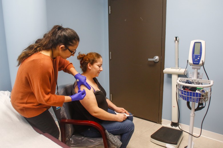 A medical assistant at Peninsula Healthcare Connection gives a patient a flu shot in 2017. Photo by Veronica Weber.