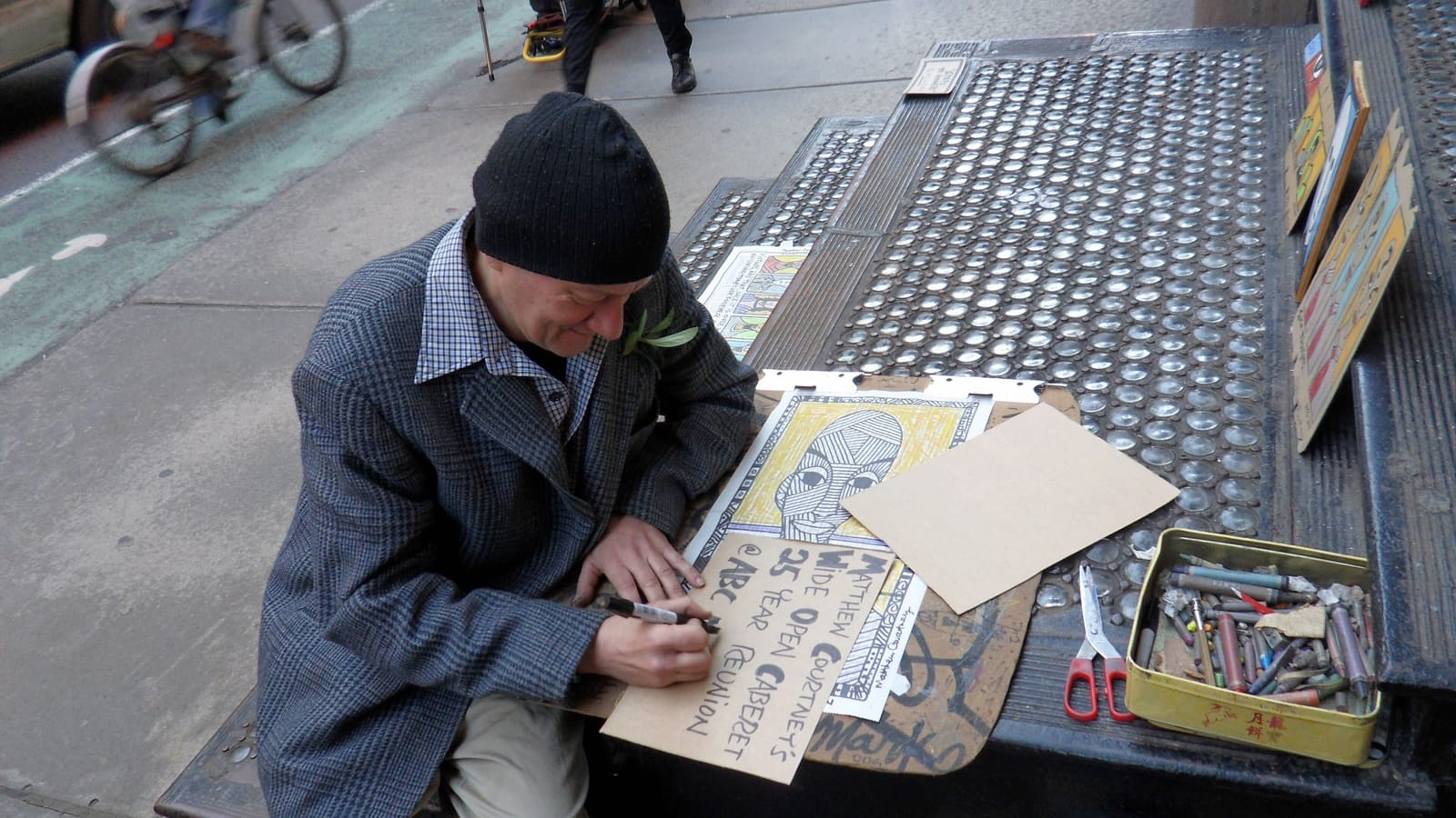 Courtney making a cardboard sign at his Soho sidewalk gallery Steps to Nowhere (photo by and courtesy Fly Orr)