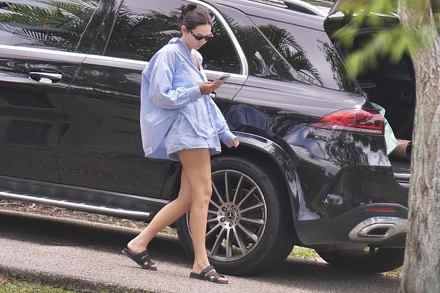 She was photographed wearing an oversized light blue button-up shirt styled loosely over short bottoms, paired with black slide sandals and slim dark sunglasses.