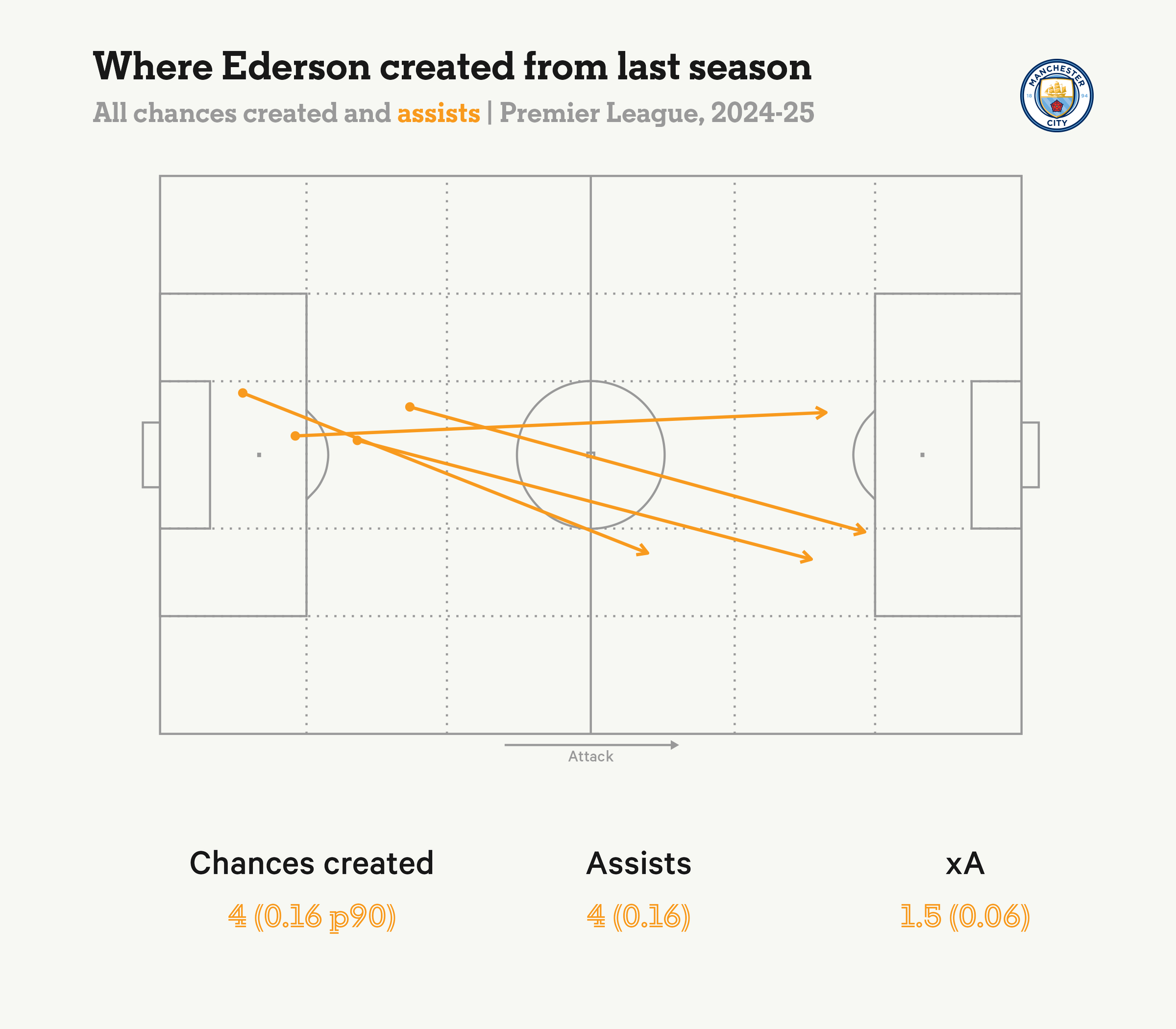 Ederson’s prowess at simply hammering the ball downfield meant he ended 2024-25 with as many assists as Bernardo Silva and Cody Gakpo, among others.