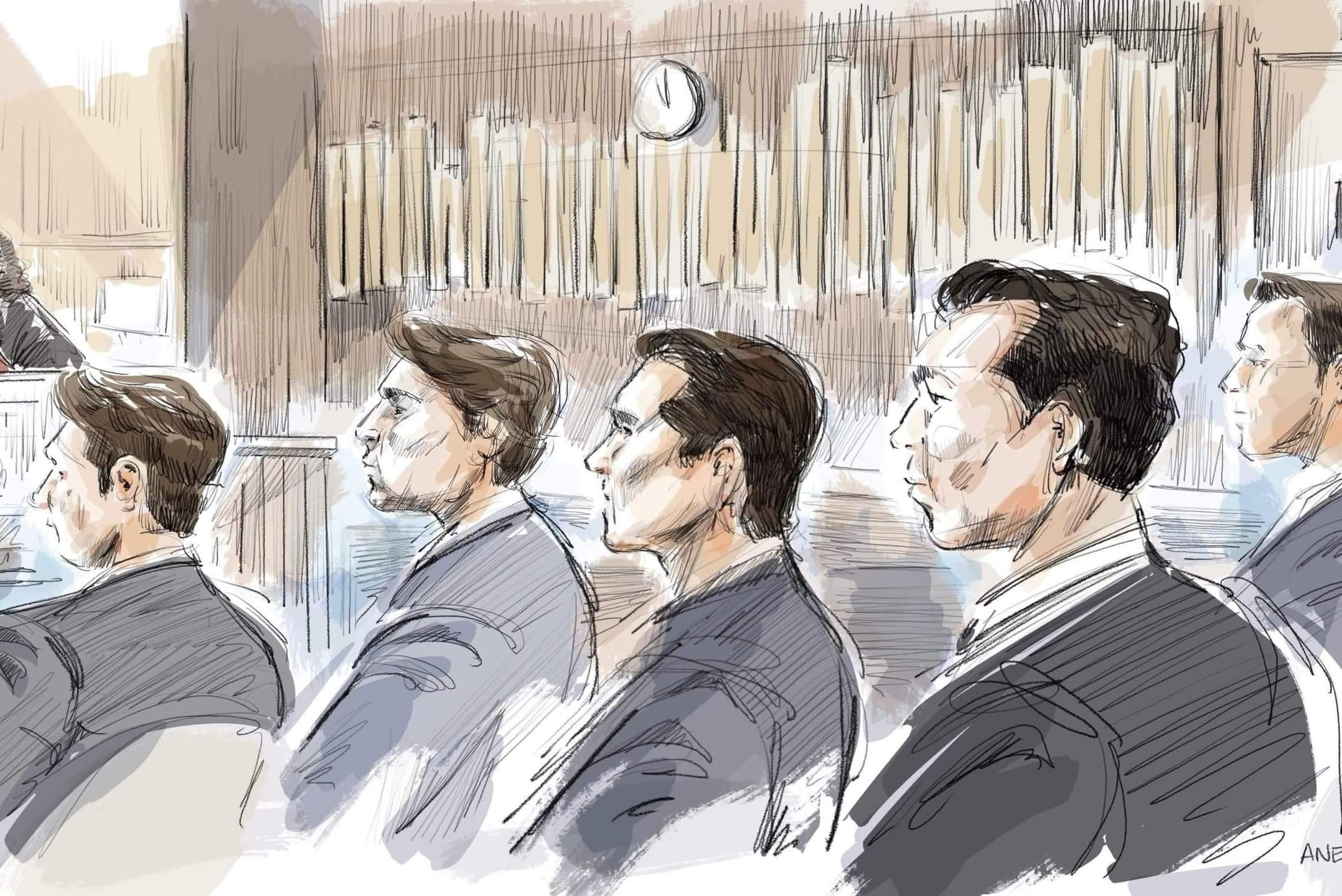In this courtroom sketch, from left, Justice Maria Carroccia, defendants Michael McLeod, Carter Hart, Alex Formenton, Dillon Dubé and Cal Foote, are shown during a hearing in April in London, Ont. (Alexandra Newbould / The Canadian Press via AP)