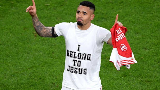 As he ran towards the corner flag in celebration, the Arsenal star lifted his shirt to reveal a white T-shirt that read “I belong to Jesus” and pointed to the sky.