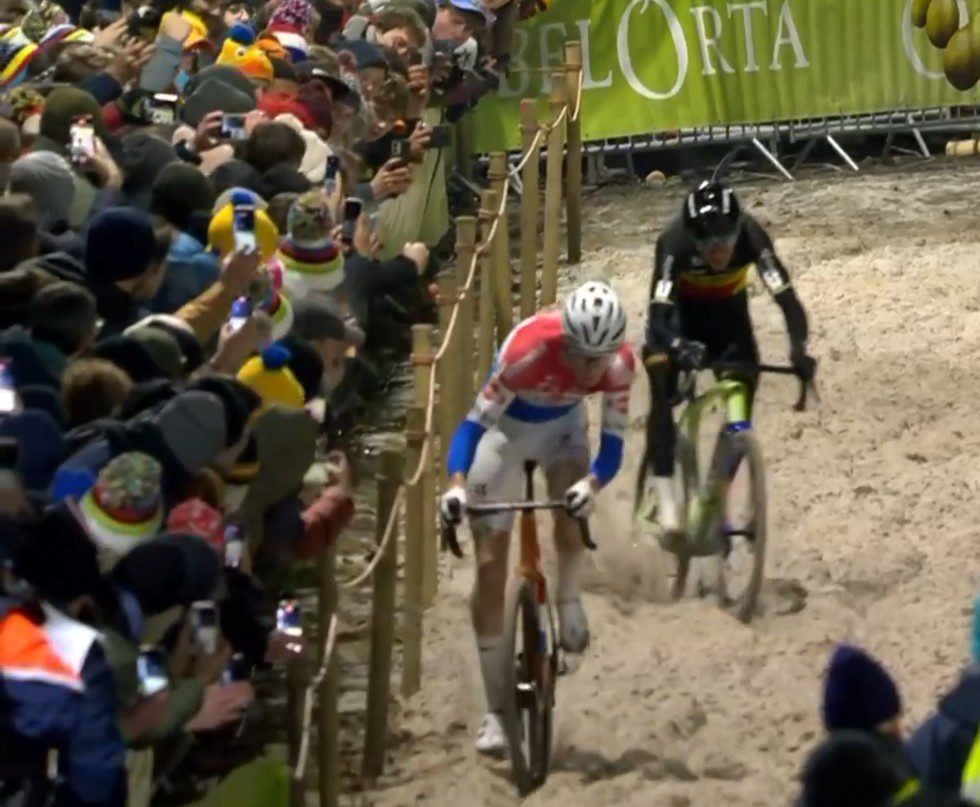 Nys had a lot of dirt ahead on which to reel in del Grosso. During Lap 3 of 9 Vandeputte pulled the next chase group. Nys yanked back two seconds. On Lap 4, Nys made contact, but del Grosso pried open more space in the sand. Vanthourenhout had clambered up to 15th.