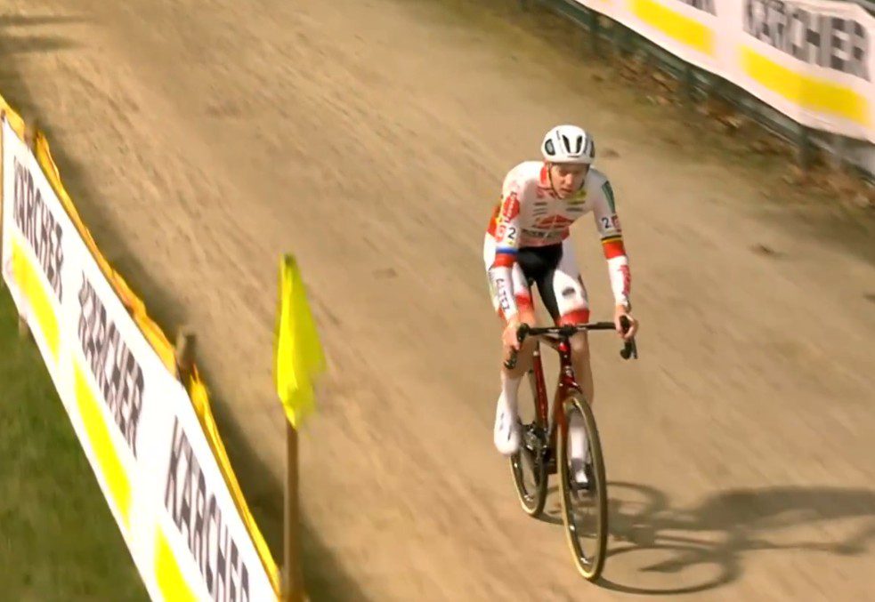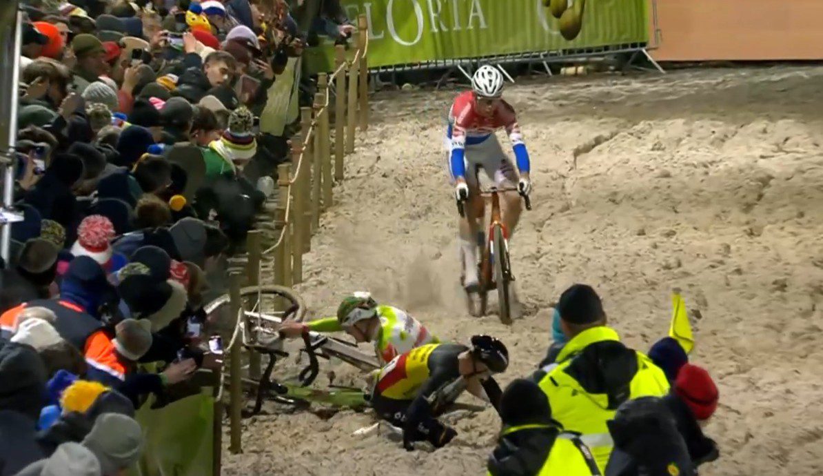 A huge crash in midpack caused by Vanthourenhout unclipping delayed the man in second place. Nys didn’t have a great start either. Mees Hendrikx and Filipe Orts were the early leaders, del Grosso lurking nearby. Del Grosso powered through the sand pit in first place. The gap was nine seconds to Nys, Vandeputte, Hendrikx, Orts and a few others.