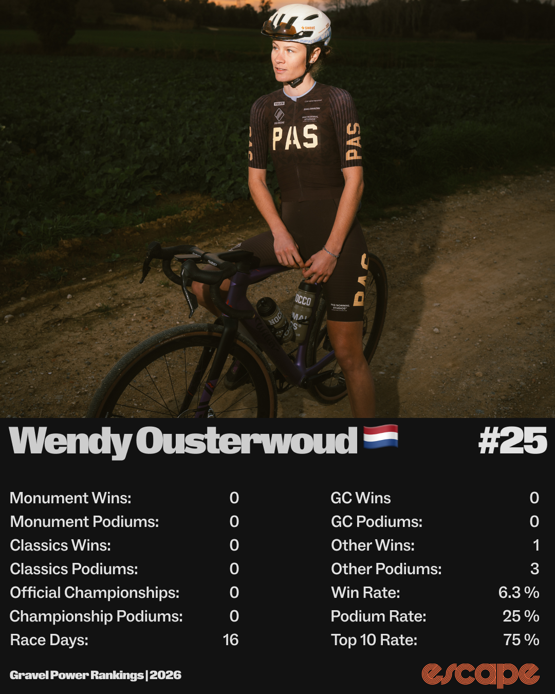 I think it’s fair to classify Wendy Oosterwoud as the least well-known lady on the PAS Racing roster. But don’t let that fool you; she is a very strong gravel racer. Her 2025 schedule centered on UCI Gravel World Series races, where she finished 11 out of her 12 races in the top 10, including three podiums and one win. While her best results came in fields that did not have the highest level of competition, winning is never easy. In UCI GWS races, in particular, you would be foolish to underestimate the elite riders just because you’ve never heard their names. Many strong women from the continental and pro road and European MTB scenes drop in those races just for funsies. And Oosterwoud managed to be there or thereabouts most of the time.