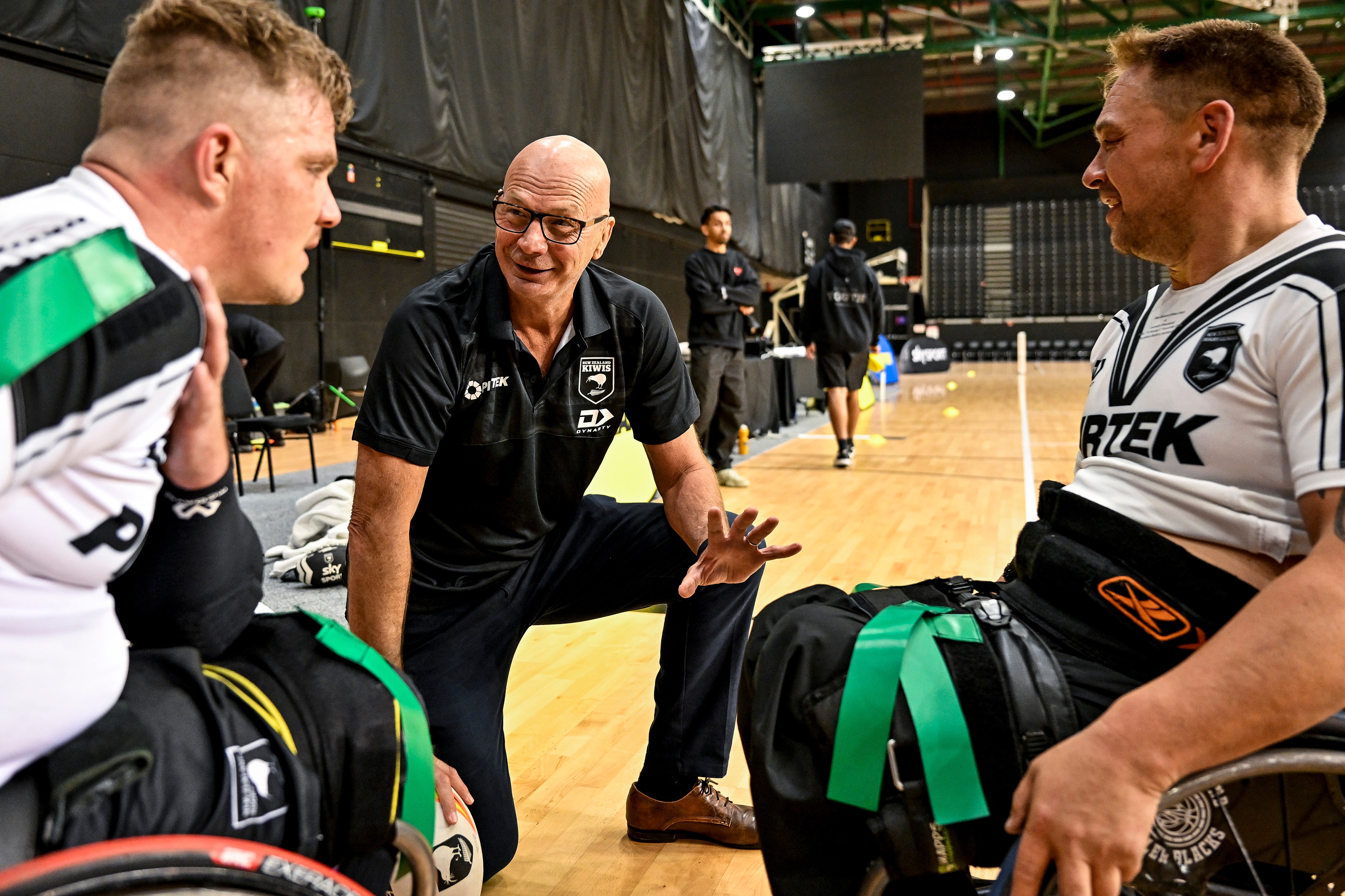 Greg Peters speaks to the players of the Wheel Kiwis. Photo / Photosport