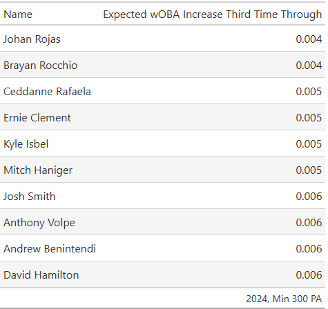 It’s one of those questions that seems obvious in hindsight and yet didn’t occur to me at all in the course of the research. Luckily, answering that question required only a small tweak to the model I used for the previous work. As a refresher, that model predicted the outcome of a plate appearance based on the batter, pitcher, ballpark, team defense, pitch quality during the at bat, and the number of times through the order it’s been. This time I would use PitchPro specifically to capture pitch quality, and I would add a batter-specific TTOP adjustment. This adjustment would look for this batter TTOP skill while controlling for the other factors and the noise inherent in a random sample of at bat outcomes.[1] Running the model for the 2024 season produced the following names at the top of the leaderboard (min 300 PA).