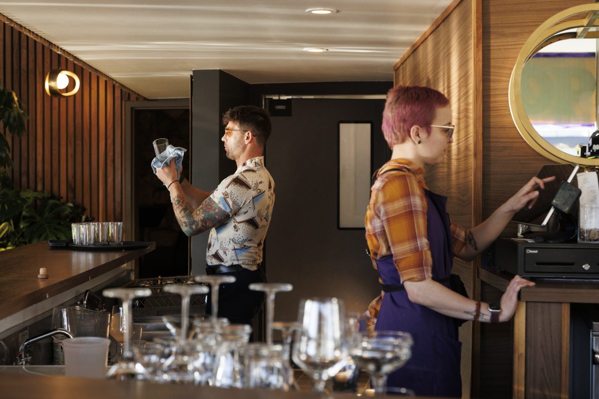 Server Nico King, left, wipes down glasses while bartender Taylor Smith, right, closes out an order Friday, Feb. 28, 2025, at Champagne Tiger. (Alyte Katilius, Special to The Colorado Sun)