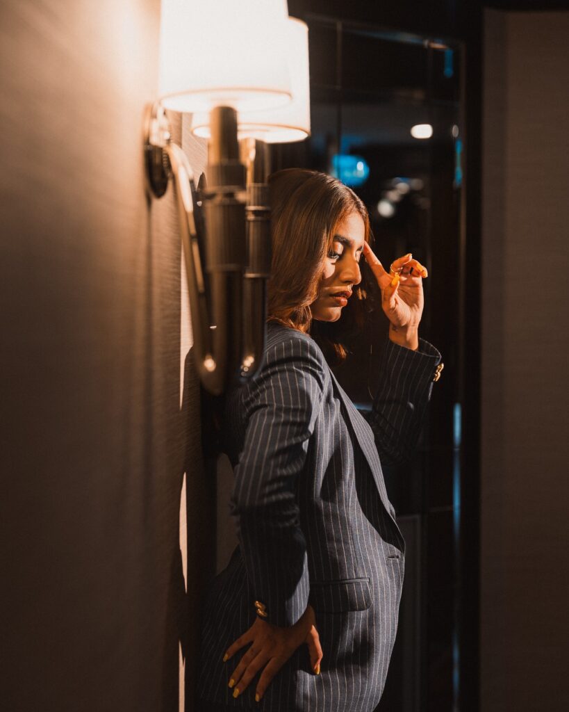 Her latest pictures show a different side of her style. She’s dressed in a pinstriped suit that feels sharp but not stiff. The fit is clean, the neckline dips just enough, and the gold buttons add a nice flash without overdoing it. Her body language keeps it relaxed. Loose hair, soft makeup, an unforced gaze. It feels less like a formal shoot and more like she just stepped into good light and owned it.