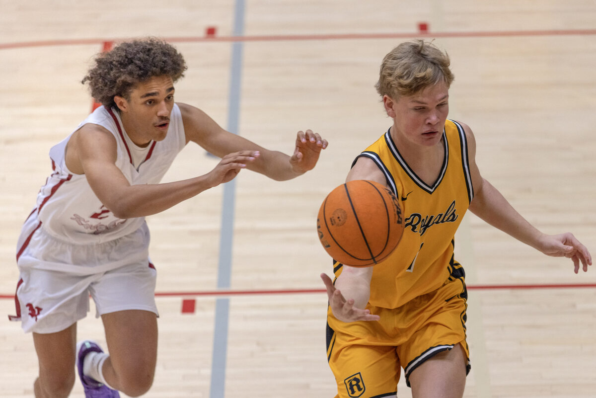 Northridge High’s Theo Roach, left, and Roy’s Rock Speredon chase a loose ball in a region game Saturday, Jan. 3, 2026, in Layton.