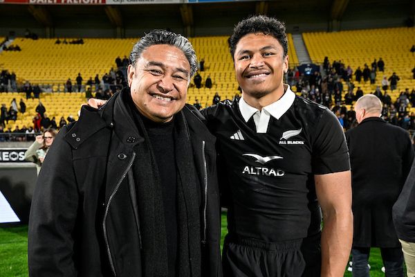 Saveatama Eroni Clarke with his son, and All Blacks winger Caleb Clarke at the Bledisloe Cup match against Australia at Sky Stadium, Wellington on Saturday 28 September 2024. Photo/Andrew Cornaga/Photosport