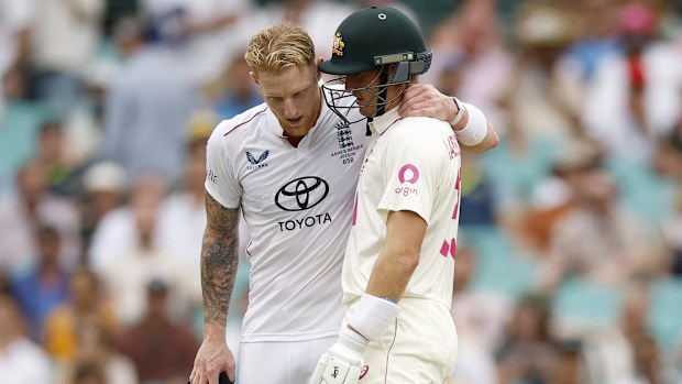 Things then got physical for a brief moment when Stokes wrapped his arm around Labuschagne’s neck and gave him a little squeeze and tap on the chest.