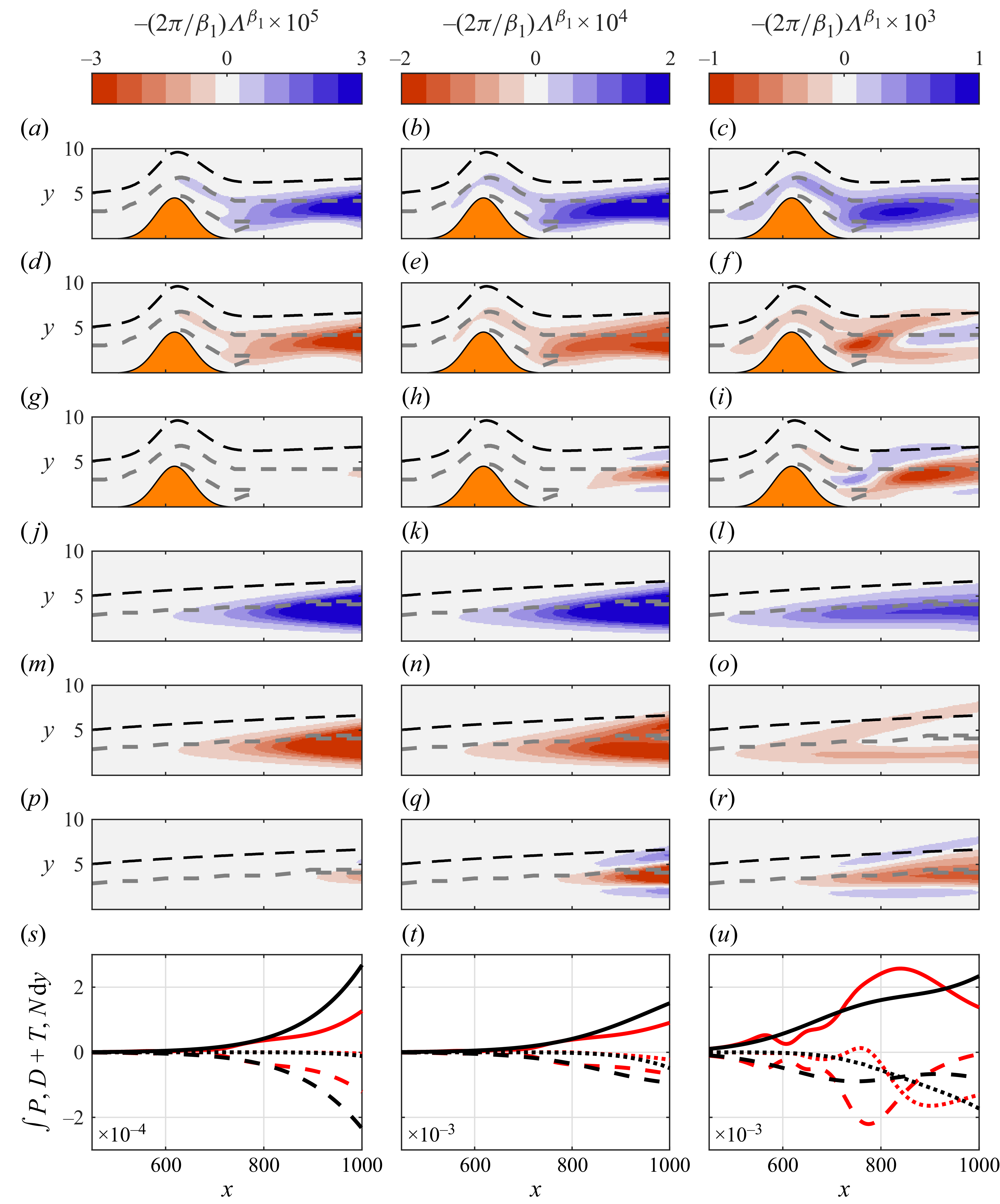 The above-mentioned analysis has suggested that the mechanisms of interaction between CFI and the hump are largely linearly dominated, inasmuch as each harmonic perturbation mode is primarily affected by hump-induced base flow modifications and only mildly influenced by mode-to-mode interactions. This is particularly evident for low inflow amplitudes of the fundamental mode. However, as the incoming CFI amplitude is increased, nonlinear effects appear to play an increasingly important role downstream of the hump, through fundamental mode saturation and strong growth of higher harmonics. To elucidate the role played by linear and nonlinear perturbation mechanisms, an energy-budget analysis of the stationary spanwise perturbation modes is carried out, see § 2.4 for details. For ease of discussion, three cases are chosen, hereafter referred to as the low-