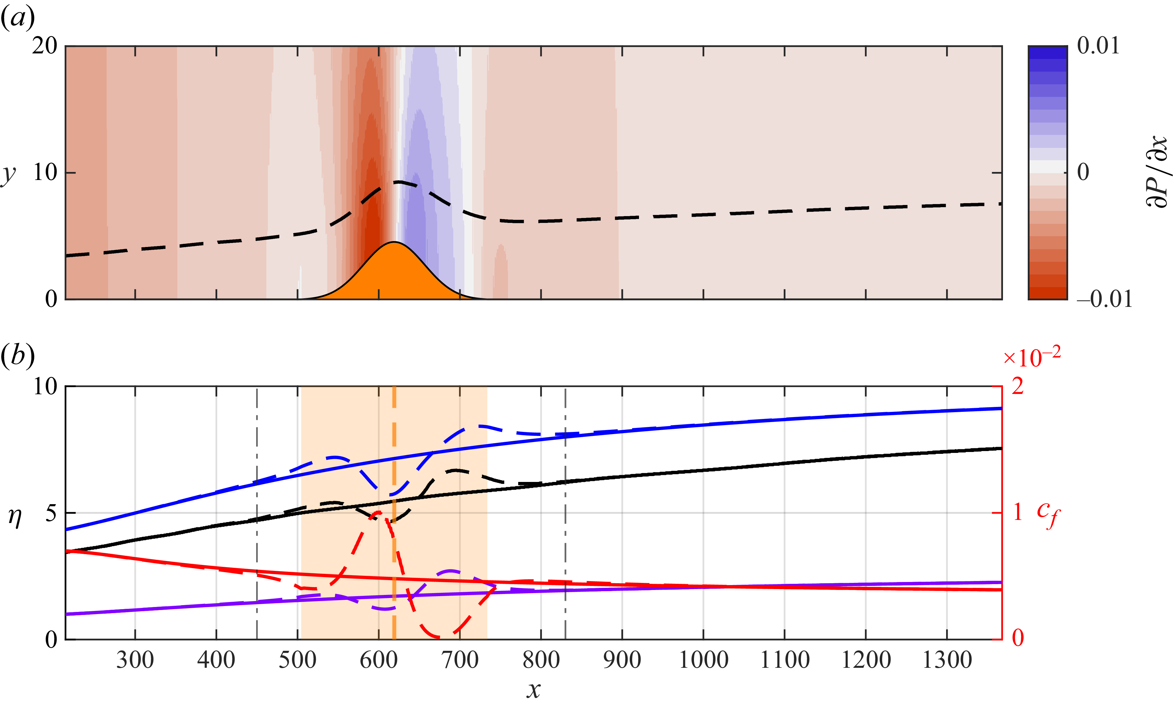 Two-dimensional, i.e. invariant in one spatial direction, surface imperfections are commonly found to promote transition governed by TS instability (see for instance Nayfeh Reference Nayfeh1992; Masad & Iyer Reference Masad and Iyer1994; Perraud & Seraudie Reference Perraud and Seraudie2000 and Worner et al. Reference Worner, Rist and Wagner2003). Gao, Park & Park (Reference Gao, Park and Park2011) used the parabolised stability equations (PSE) method to study the interaction between incoming TS waves and a smooth hump, and found significant instability growth downstream of the hump. The main hump shape prevented the local formation of recirculating flow potentially giving rise to a global instability mechanism (Xu, Lombard & Sherwin Reference Xu, Lombard and Sherwin2017). However, for additional variations of the hump shape, the effects of the induced adverse pressure gradient and flow separation contribute to the destabilising influence of the hump. Park & Park (Reference Park and Park2013) carried out a similar analysis accounting for nonlinear perturbation effects. They described that the hump promotes instability growth even for perturbations with a small initial amplitude. Furthermore, it was noted that the amplitude of the incoming perturbation conditions the secondary instability growth more prominently than the shape of the hump. Franco Sumariva et al. (Reference Franco Sumariva, Hein and Valero2020) used the adaptive harmonic linearised Navier–Stokes (AHLNS) method to investigate the effect of two-dimensional humps that are either smooth or rectangular (i.e. a combination of forward- and backward-facing steps). They reported an increase in the perturbations amplitude downstream of the hump that is proportional to the height of the hump. Moreover, they found that the shape of the hump, i.e. smooth or rectangular, becomes increasingly important when the hump is of greater height.