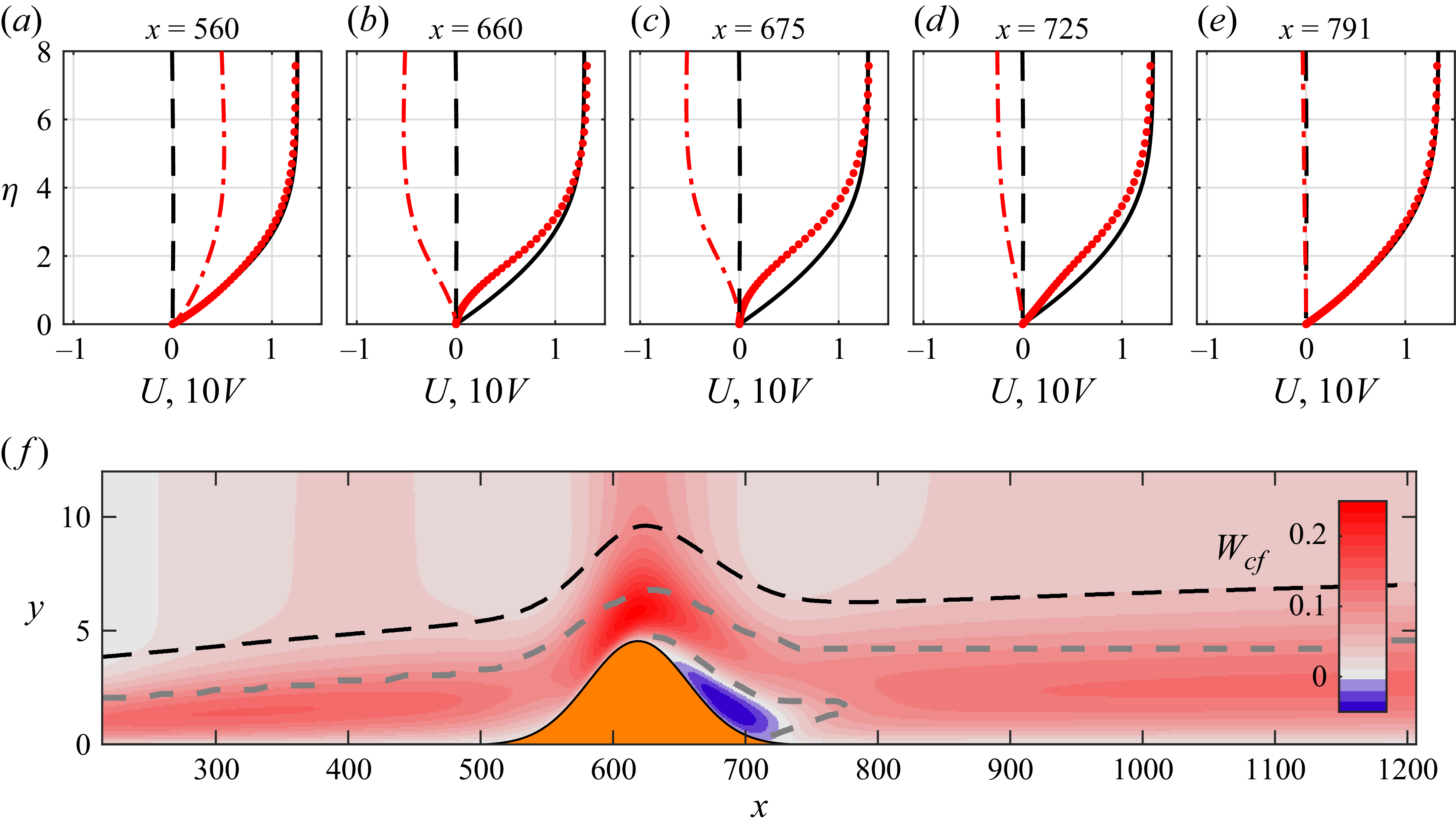 ) corresponds largely to the region in which a secondary near-wall peak was identified in the linear perturbation profiles in figure 7. In the same region, local parallel stability analysis based on the OS equation predicts a strong spanwise deformation and a double-peak shape for the primary unstable mode near the wall. Furthermore, the OS analysis also identifies a short-lived new near-wall mode, emerging purely within the region of cross-flow reversal. Such near-wall structures are, in fact, present in all cases in this work, and are preconditioned in amplitude by the incoming CFI. Considering the above-mentioned observations, a key delineation can be made between beneficial and adverse effects on the transition scenario. Specifically, for medium-to-high CFI amplitudes, this near-wall production dominates local instability growth and leads to the development of highly amplified near-wall structures. Presumably, the strong shears resulting from these structures can provide fertile ground for the development of unsteady secondary instabilities, in a manner similar to the development of type-I and type-II modes in classical saturated CFI (Malik et al. Reference Malik, Li, Choudhari and Chang1999). These in turn can lead to laminar breakdown and accelerated transition observed in the high-amplitude DRE experiments of Rius-Vidales et al. (Reference Rius-Vidales, Morais, Westerbeek, Casacuberta, Soyler and Kotsonis2025). In contrast, for low to medium incoming CFI amplitudes, this near-wall production is present but not strong enough to overtake the overall stabilising effect of the hump on the original incoming CFI. Instead, lasting stabilisation is observed downstream of the hump as a result, which in turn can be linked to the low-amplitude DRE case in the experiments of Rius-Vidales et al. (Reference Rius-Vidales, Morais, Westerbeek, Casacuberta, Soyler and Kotsonis2025), where transition delay was achieved.