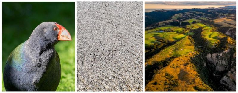 From left: The flightless takahē, of which only 550 exist; fresh kiwi tracks in a bunker at Cape Kidnappers GC; the course’s deep ravines are another kiwi favorite, for their year-round moisture (and bugs). (Credit: SocialImage.co.nz for the bird shot; Nick Wall/AirSwing for the aerial; all others courtesy of Cape Kidnappers GC.)