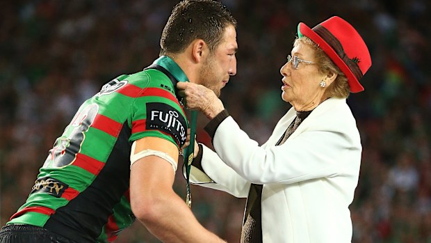 Joyce Churchill presents Sam Burgess with the Clive Churchill Medal in 2014. Getty