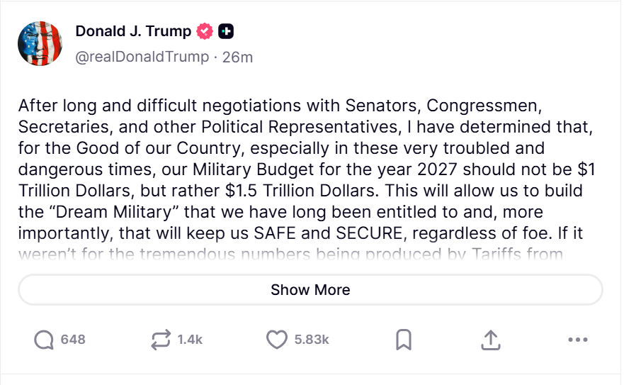 US President Donald Trump has posted on his Truth Social account that the military budget for 2027 should be $US1.5 trillion dollars.Â