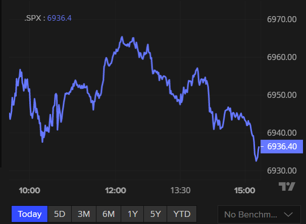 As Wall Street closes for the day, the S&P 500 is down -0.4% to 6,921 points.