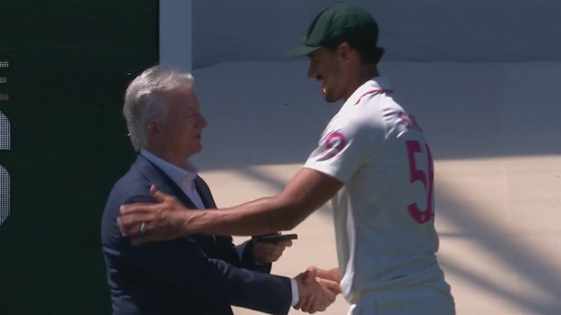 Mitchell Starc accepts the Compton-Miller Medal. Fox Cricket