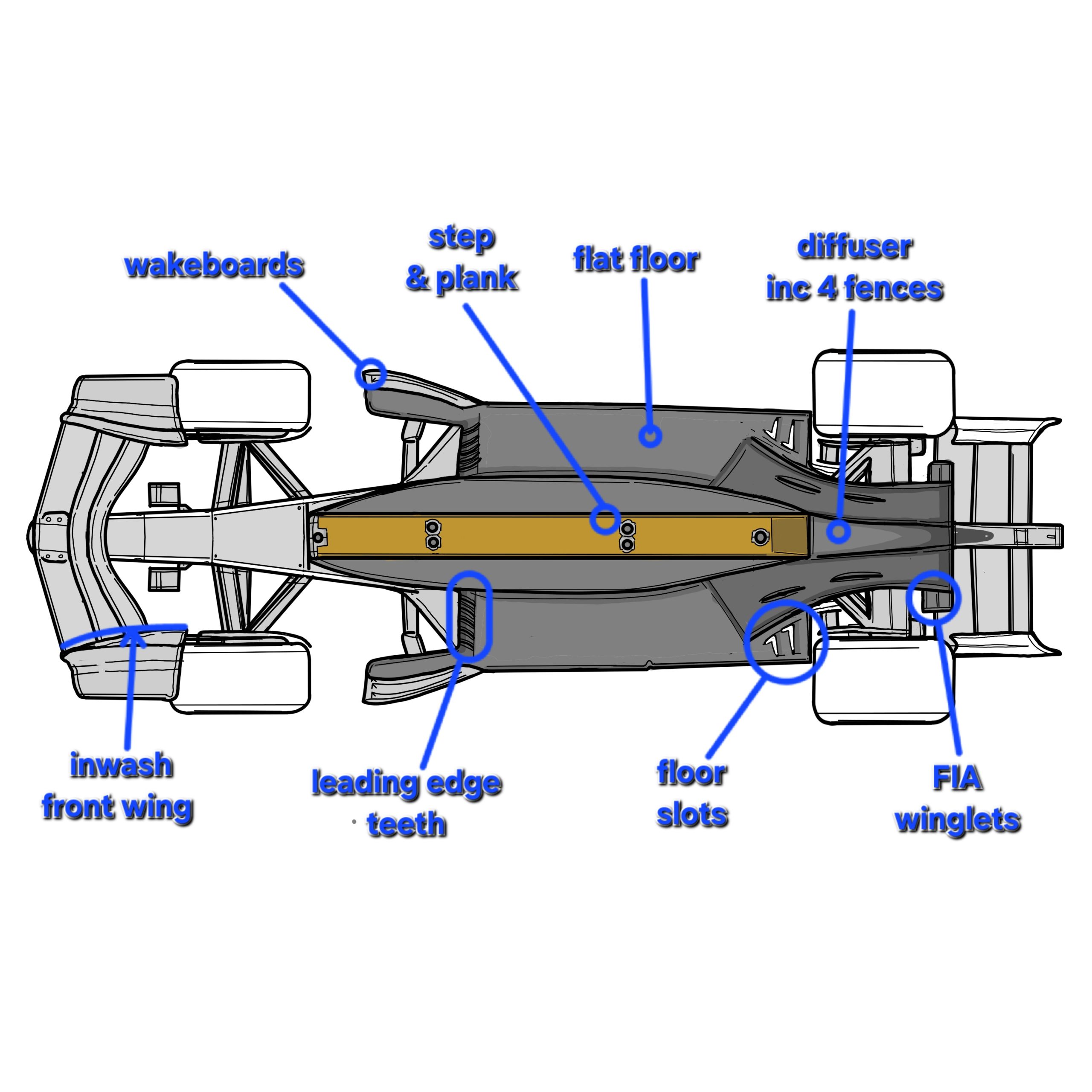 There is an allowance to create more downforce at the front of the floor, with teeth at the floors leading edge and an axe head shape to the floor underneath the wake boards.