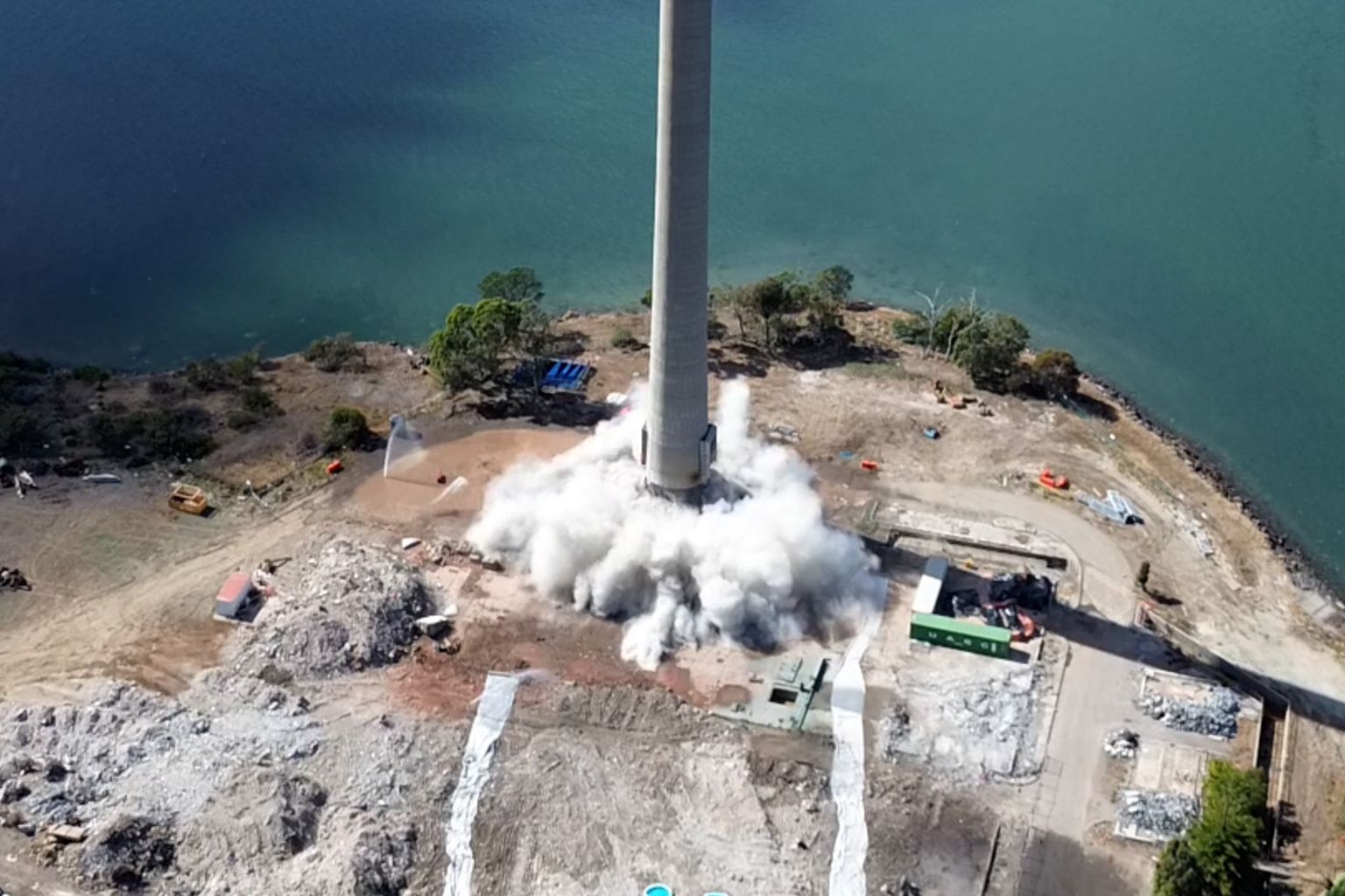 The 110-metre chimney stack at Tasmania’s former Bell Bay power station has been brought down in a controlled blast.