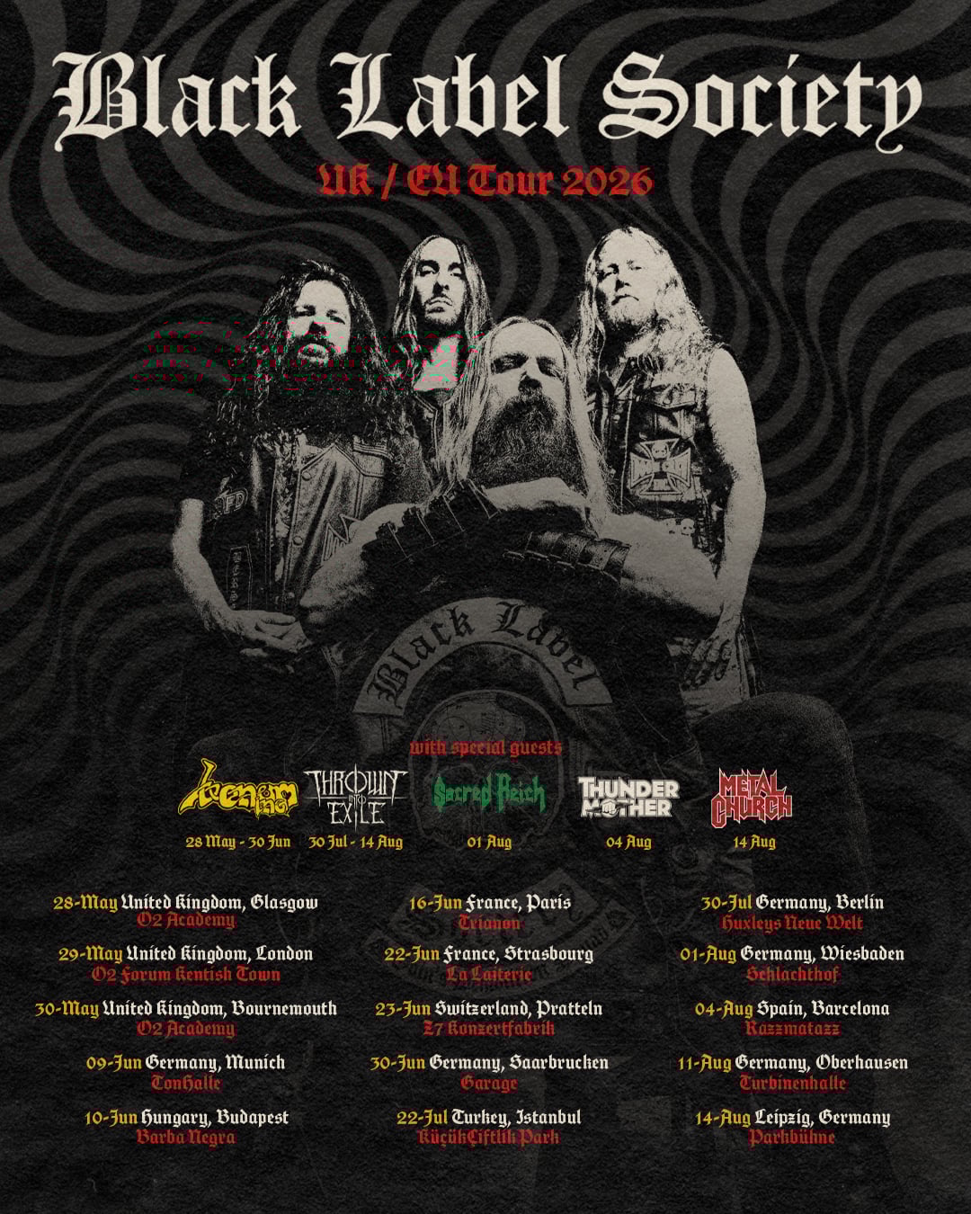 BLACK LABEL SOCIETY will embark on a European tour in May. Support on select dates will come from VENOM INC., THROWN INTO EXILE, SACRED REICH, THUNDERMOTHER and METAL CHURCH.