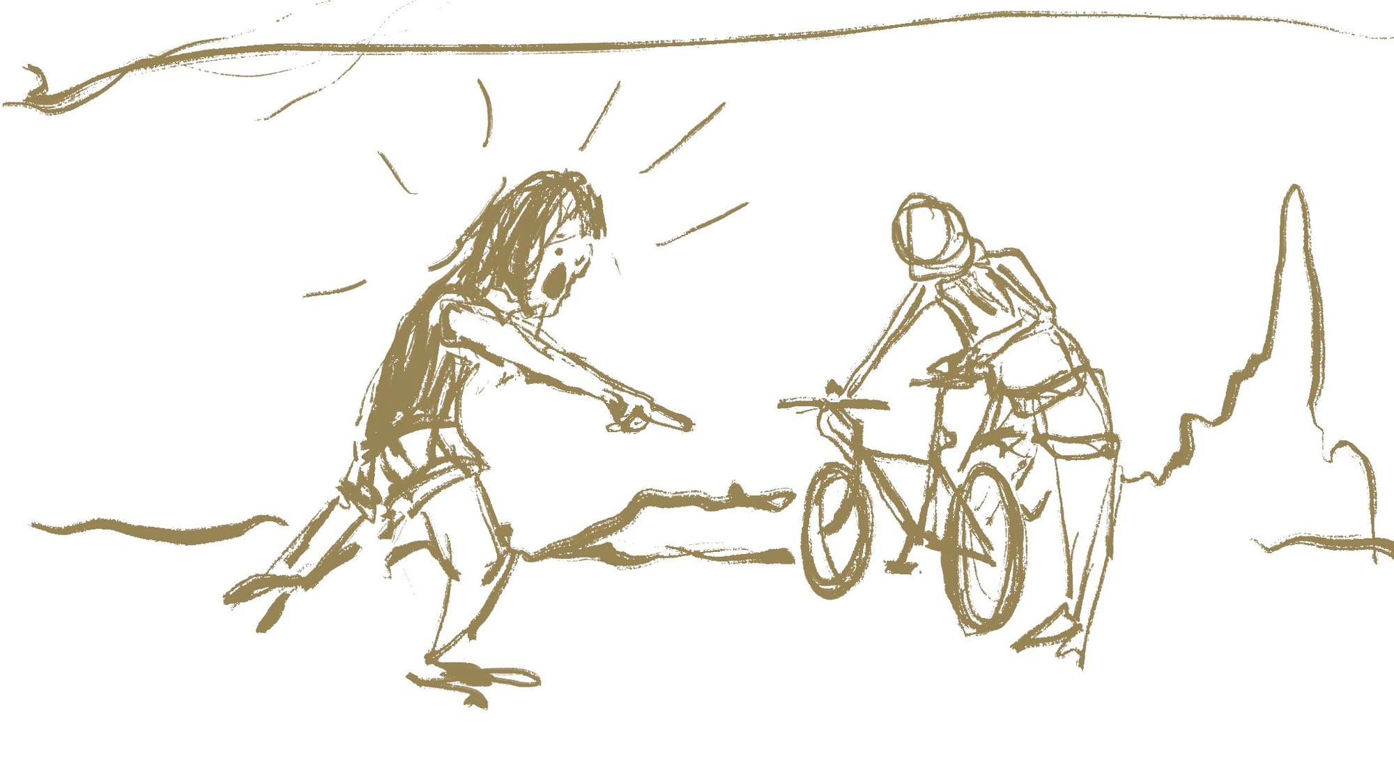 As the road narrowed and the first switchback appeared in front of him, Russell noticed a four-wheel-drive Jeep approach from behind. The Jeep was open-topped, and the occupants could be seen clearly, appearing nonchalant yet still enamoured of the scenery. The group stood out and was certainly not recognizable as locals. The Jeep rolled past Russell and slowed to a stop as he pedaled alongside the vehicle. A wiry figure with long hair and dark glasses rose up from the jeep and jumped out.