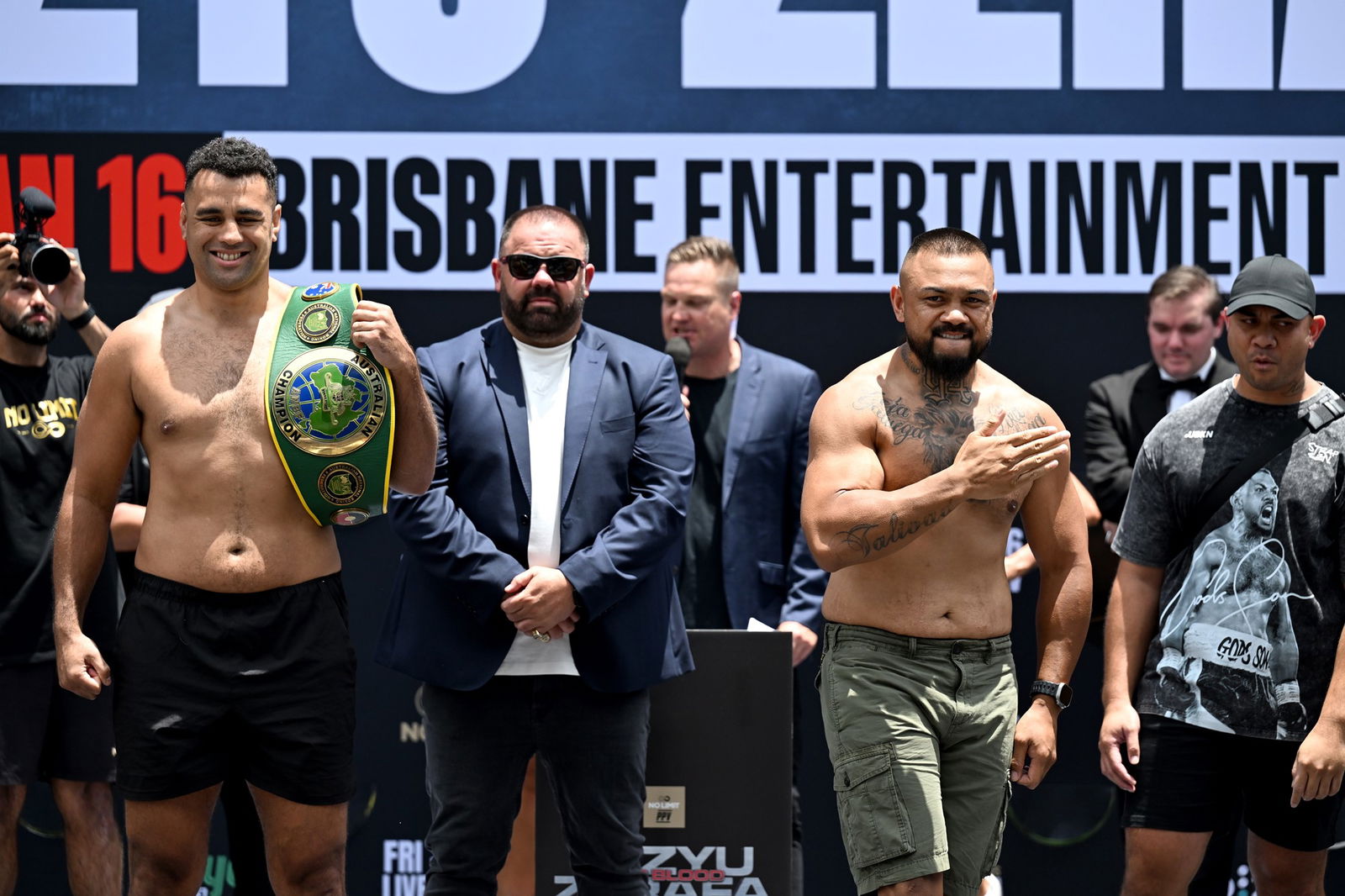 A massive crowd in Brisbane watches, engrossed as the two big men meet in the middle of the ring again.
