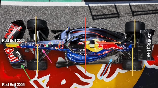 Looking at this overhead comparison gives us the chance to see how Red Bull went about achieving the now shortened maximum wheelbase, which drops from 3600mm to 3400mm by regulation for this year.