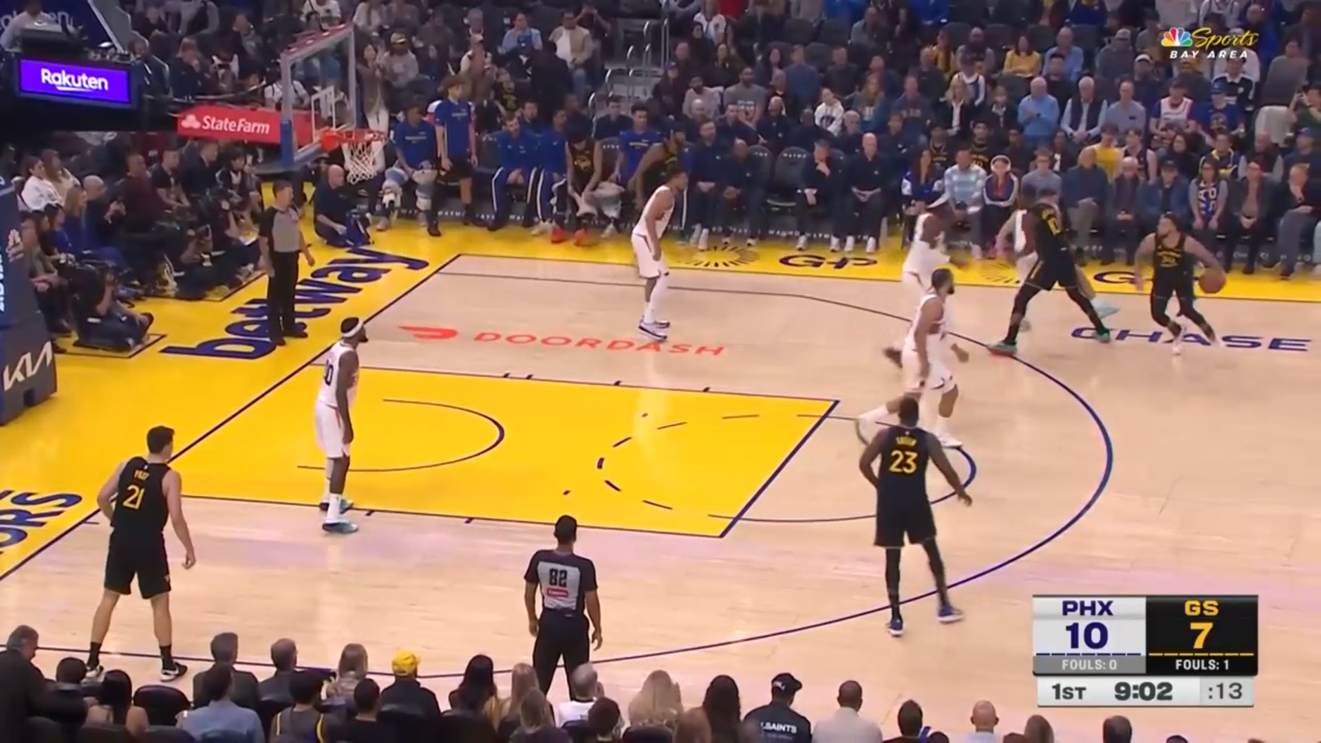 With Collin Gillespie caught against Butler’s screen, Williams is compelled to step up and commit to a switch against Curry, while Brooks tries to stay put at the gap despite Green drifting deeper toward the wing. Not wanting Williams to take Curry in isolation, Gillespie attempts to recover toward Curry instead of sticking to Butler, perhaps in an effort to double Curry and pressure him at the point of attack. Meanwhile, Devin Booker stays fairly attached to Moses Moody in the corner, with Royce O’Neale being the low man guarding Quinten Post in the weak-side corner.