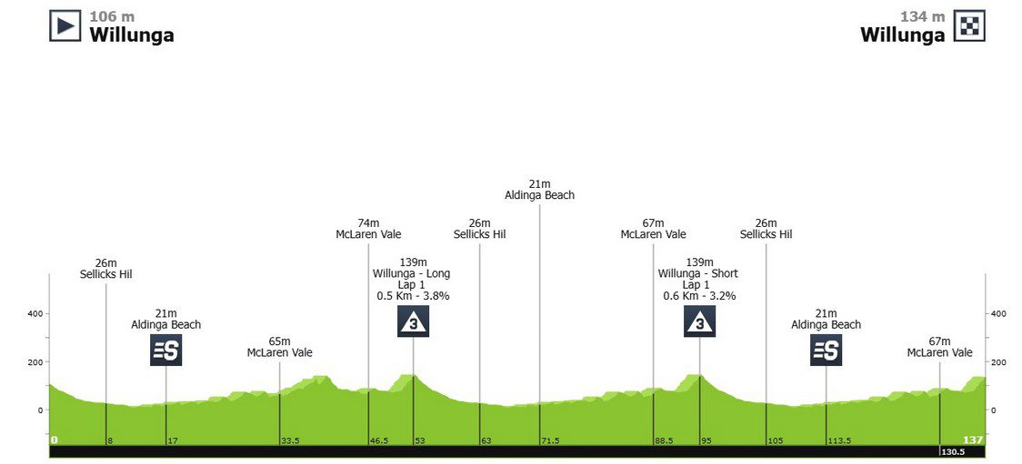 It would be a bit deceptive to claim the riders would be climbing Willunga Hill thrice in 137 km including a summit finish. Willunga would be the 500 metres of 3.8 percent instead of the usual 3.2 km of 7.2 percent. Thankfully, it wasn’t too hot.