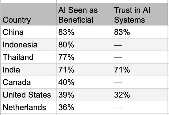 In China, possibly because of the less dominant role of service-sector professionals discussed above, as well as many cultural factors, and because of less circular effects of media doomerism, 83% of people see AI products and services as more beneficial than harmful. This is as per the Stanford HAI’s AI Index 2025. In the United States, that number is 39%. In Canada, 40%. In the Netherlands, 36%.
