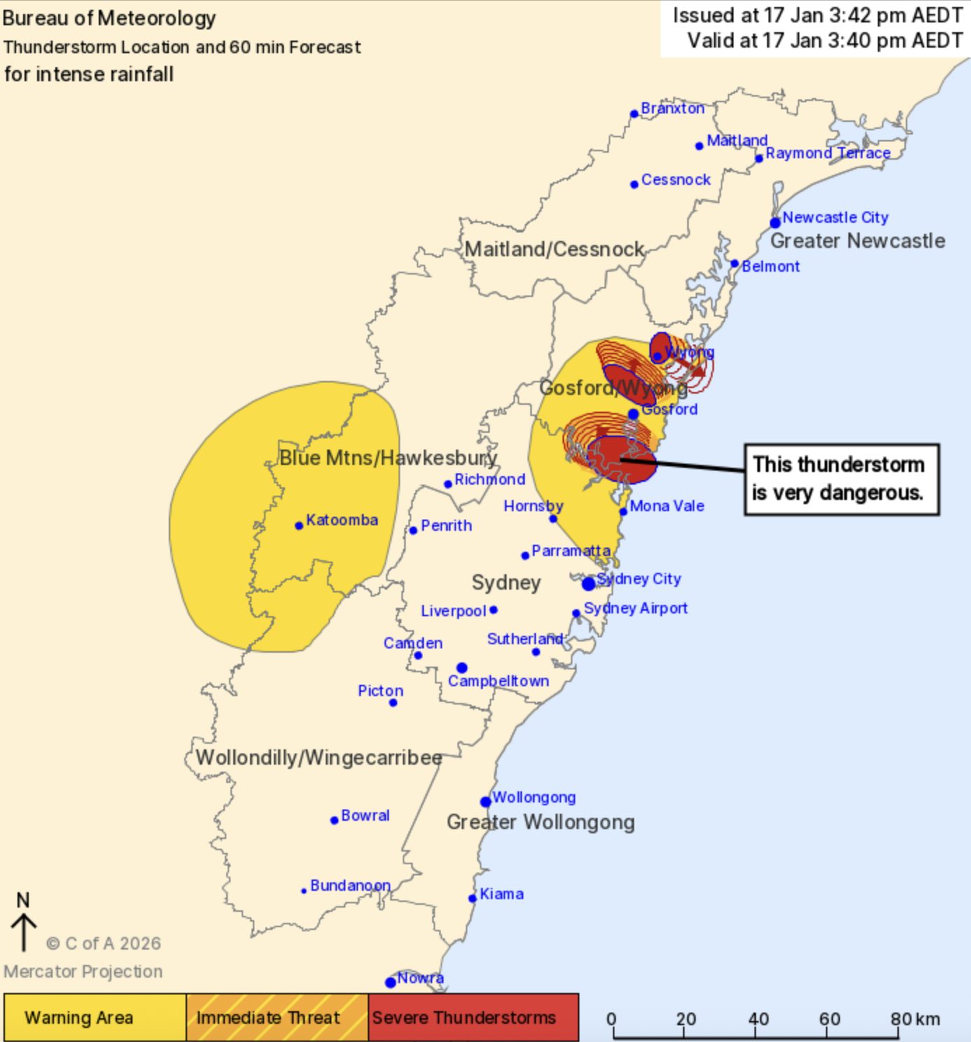 The Bureau of Meteorology issued a Watch and Act warning for areas north of Sydney, with very dangerous thunderstorms detected near Terrigal and Palm Beach.