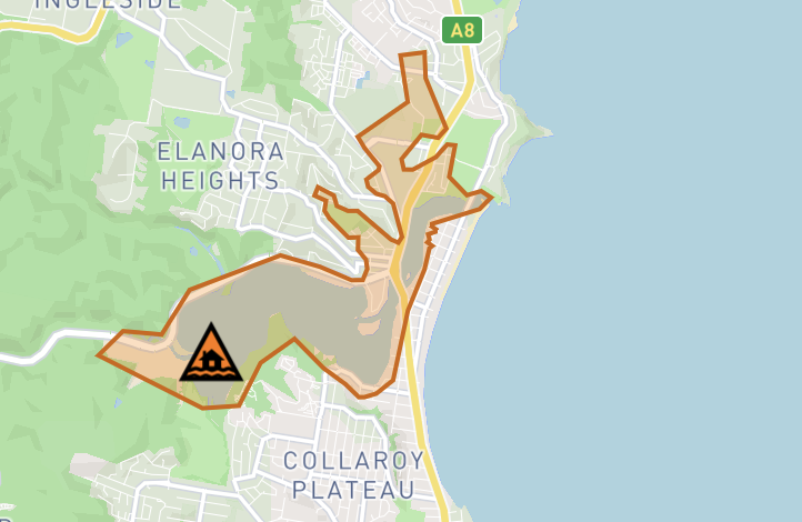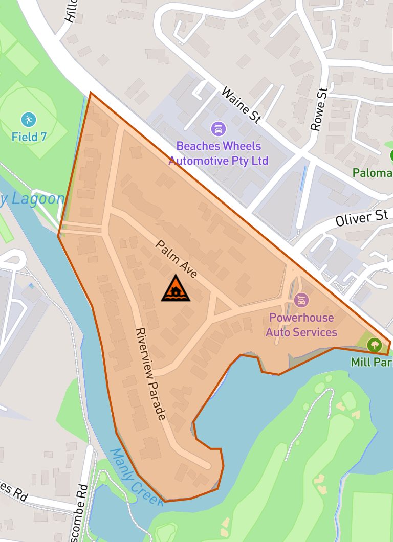 The NSW SES advises people in the following area(s) NOT TO ENTER FLOODWATER due to current localised flooding along the northern bank of Manly Creek bounded by Nolan Reserve, Pittwater Road, Manly Creek and Mill Park – including Riverview Parade, Palm Avenue and Lakeside Crescent.