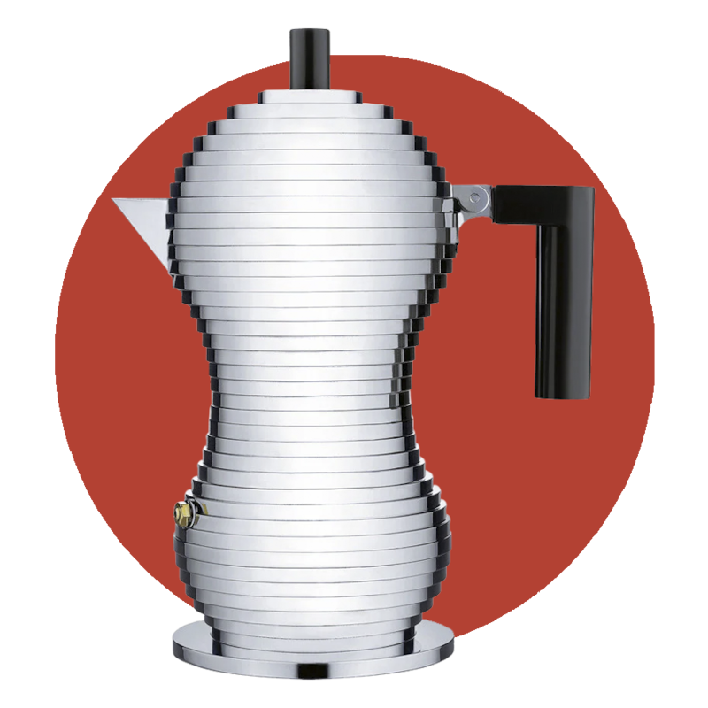 An espresso-coloured kitchen demands a great coffee maker. Chris uses the Pulcina by Italian architect Michele De Lucchi. The bulbous shape and series of connected inner chambers are meant to reduce the amount of bitterness produced in brewing.