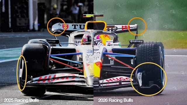 Gone is the integrated intersection between the outer end of the wing and the mainplane and flaps. I’ve highlighted that with the orange ellipse above, and taken the close-up crop of the 2025 and 2026 Racing Bulls comparison image below with orange ellipses on that element of the cars.