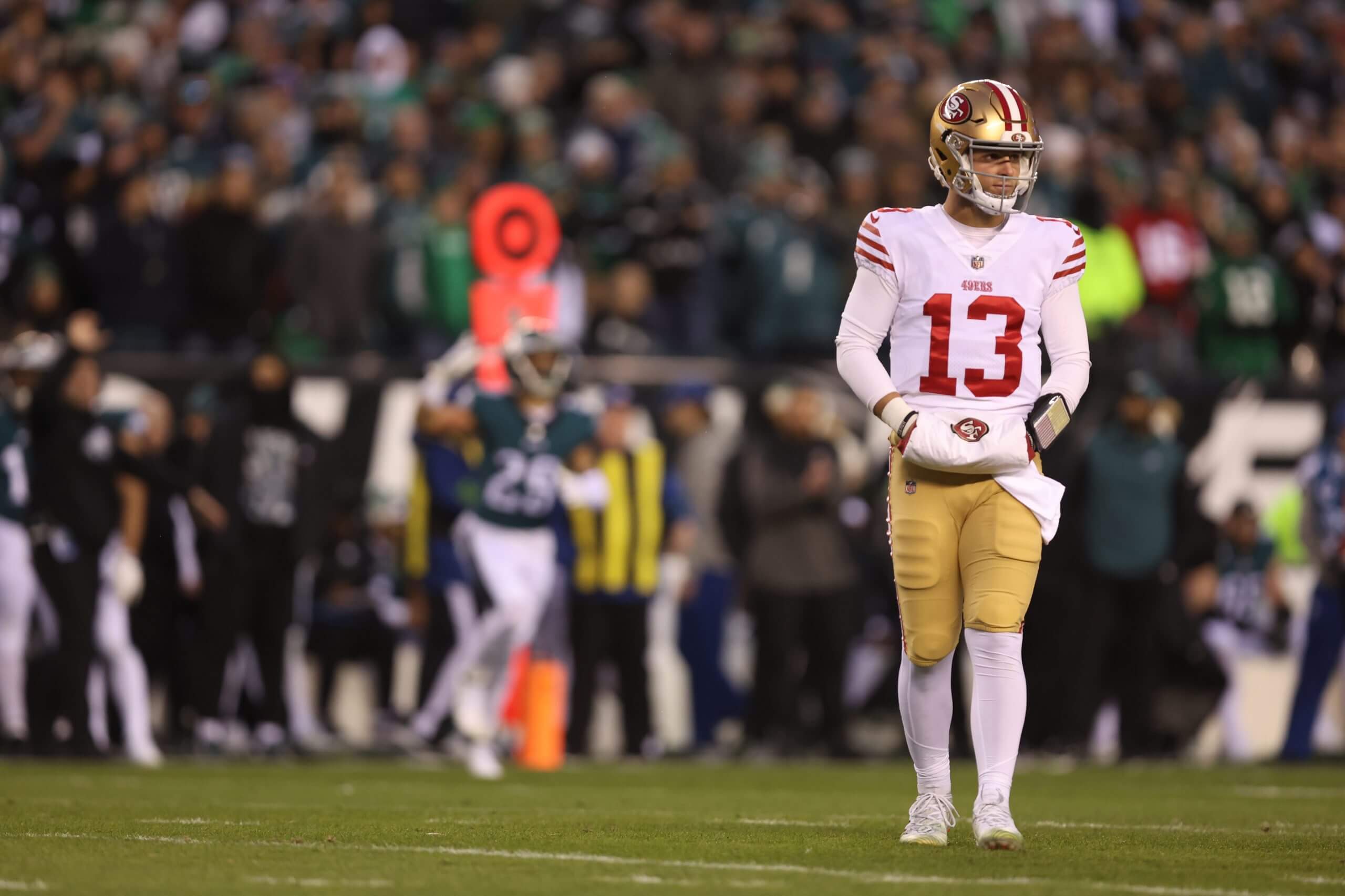 Brock Purdy’s magical rookie season came to an end when he was hurt in the 2023 NFC Championship Game against the Philadelphia Eagles. (Perry Knotts / Getty Images)
