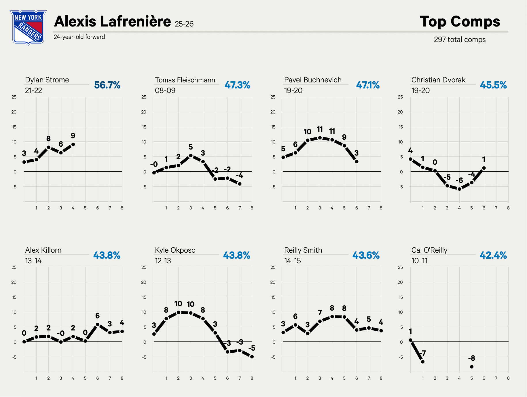 Lafrenière has shown it’s possible — go back to 2023-24, when his comps put him on a similar path to Mika Zibanejad and Travis Konency. It’s just that he hasn’t backed it up; he is back to the 1.90 points per 60 range, which has become his sweet spot in three of the last four years. His shot volume, scoring chance generation and overall play-driving have also dipped since that breakout.