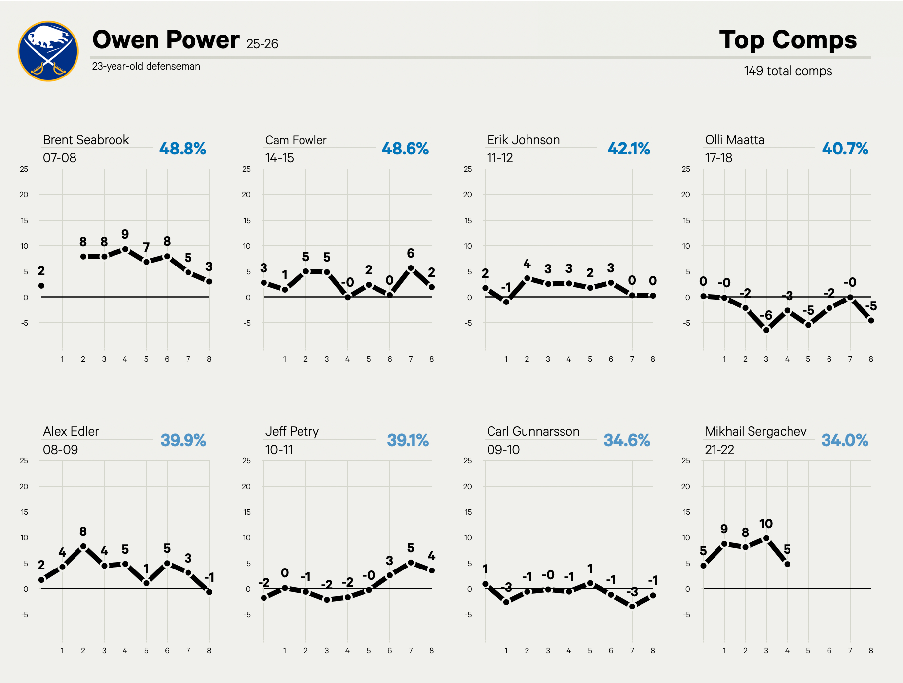 The Sergachev comp feels extremely fitting, since his road to becoming a No. 1 in Tampa Bay was blocked by Victor Hedman (while Power’s is by Dahlin). Power, like Sergachev earlier in his career, isn’t his team’s power-play quarterback, which has limited his scoring potential. But the one benefit of not being the team’s true No. 1 is not having to take on as hefty a workload. And in theory, that should free him up to play to his strengths.