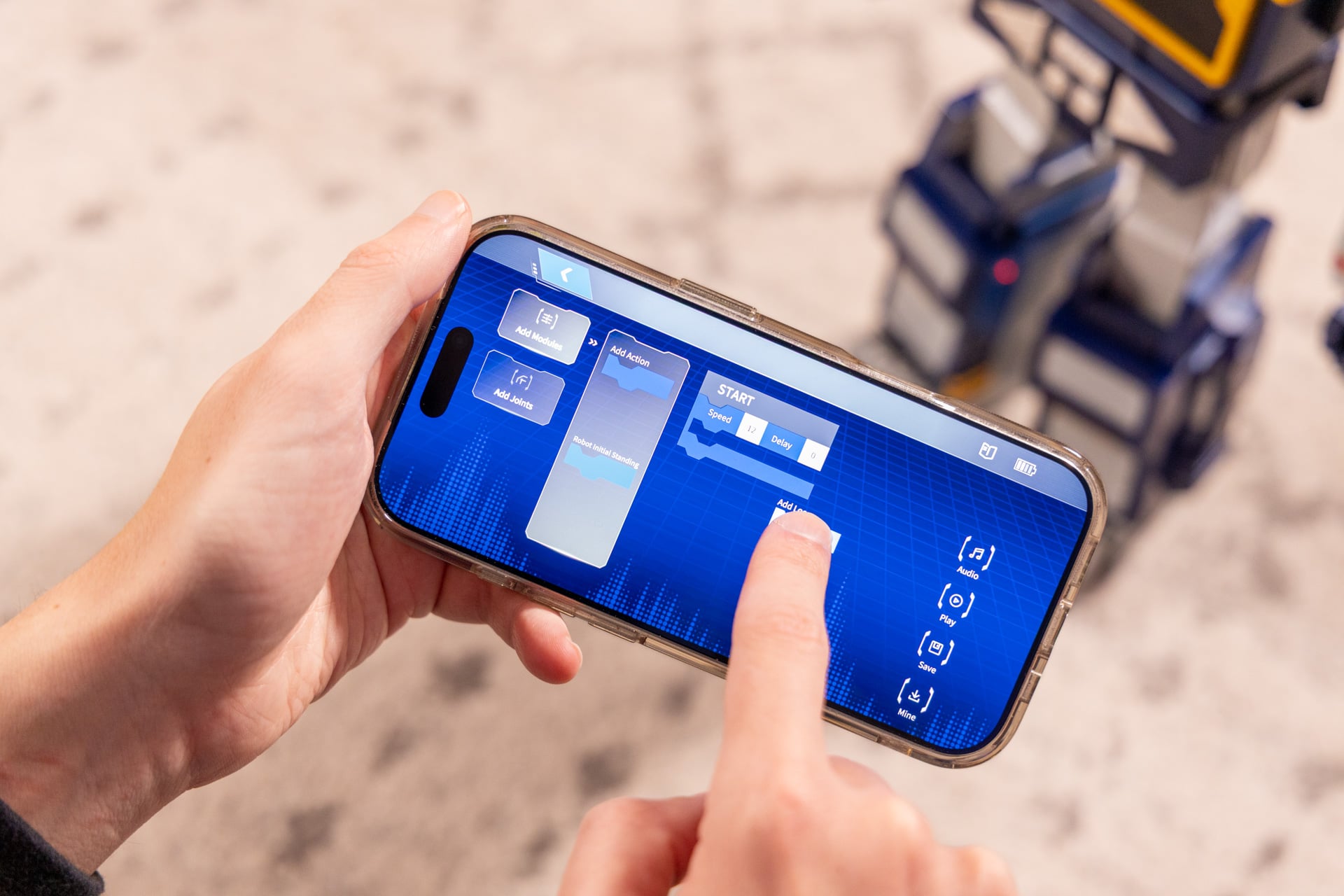 Here, you can use a touchscreen D-pad to tell Soundwave to walk around (it can move left, right, forward, or backward), and you can even program your own actions. Action programming, I must warn you, is pretty far from intuitive, though I did have some minor success with using the block-based programming UI to get Soundwave to do simple stuff like twist its arms. It’s a nice touch, but I’m willing to wager that most people aren’t going to want to spend loads of time in the app programming this thing.