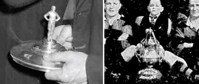 Interestingly, it was noted of the Swinson Cup’s manufacture in 1919 that, “the trophy, which is of unique design, is provided with a special arrangement whereby the colours of the winning club may be inserted”, a description which Touchline feels is spookily reminiscent of the “missing lid” of the current Jubilee Cup, which had the figure of a player with his hands on hips, through which a ribbon of the winning team’s colours was commonly inserted, (as shown in the photos below).