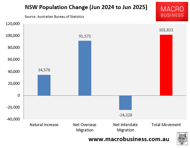According to the most recent quarterly population figures from the Australian Bureau of Statistics (ABS), the population of New South Wales (NSW) increased by 101,821 during the financial year 2024-25, driven almost entirely by net overseas migration (NOM) of 91,573: