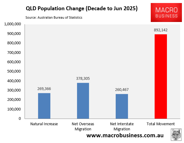 In the decade to 2025, Queensland received 260,467 residents from other states (almost the same number that left NSW), as well as 378,305 people from overseas.