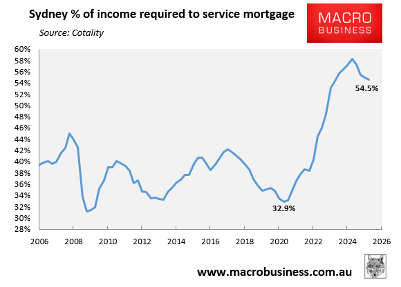 A median Sydney household was required to spend 54.5% of its income to service a new mortgage on the median-priced home in the September quarter of 2025. This was easily the highest in the nation, well above the national average of 45.0%: