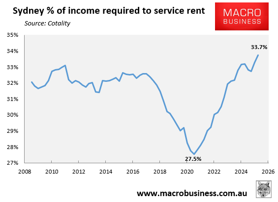 As a result, the percentage of income required to service rent on the median Sydney home was a record high of 33.7% in the September quarter, up from a low of 27.5% in the December quarter of 2020: